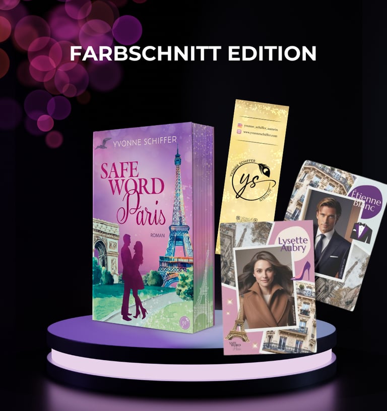 "Safeword Paris" gibt es jetzt in einer exklusiven Buchbox. Enthalten sind die Charakterkarten, ein Lesezeichen sowie eine limitierte Auflage mit wunderschönem Farbschnitt - natürlich handsigniert.